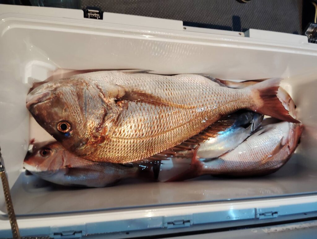 午後便も真鯛好調。しかし.お祭り多発で釣りにならず…途中竿一本で、交代で頑張って頂きました。それでも入れ食いで、真鯛🎶 真鯛‼️ ヒラマサもGET‼️